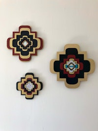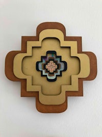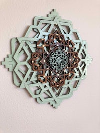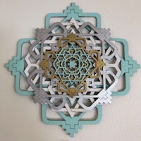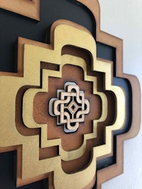 Lasercut Yantras, hand painted and assembled. Layered intricacies stacked, black, gold, holographic, dichromatic, elements that draw you in and emanate the sacred order of geometry. Harmonise and protect your space.