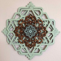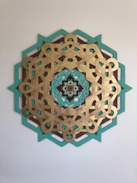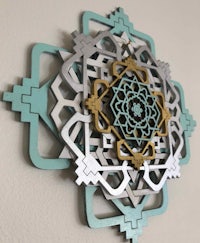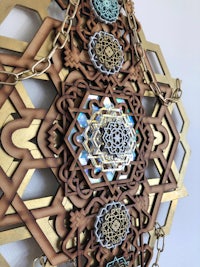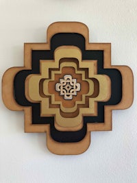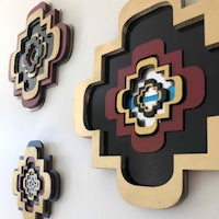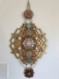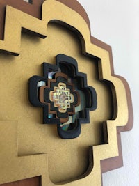 Lasercut Yantras, hand painted and assembled. Layered intricacies stacked, black, gold, holographic, dichromatic, elements that draw you in and emanate the sacred order of geometry. Harmonise and protect your space.