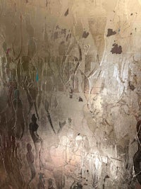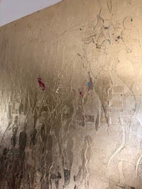 A gold leaf surface with texture beneath. This piece changes with the light throughout the day. Coloured vinyl and birch wood visible through the golden surface.